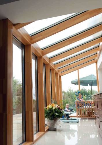 Споконвіку дерево було основним будівельним матеріалом в Росії, його цінували за широкий спектр використання, зручність обробки, довговічність, доступність. У наш час дерево асоціюється з певним стилем, затишком і комфортом теплого будинку. Текстура будь-якого дерева унікальна, всілякі відтінки і природний візерунок деревини дозволяють реалізувати будь-які побажання клієнта. Можна так само додати дереву різну форму, а приховане кріплення, розроблене спеціально для зимових садів, дозволяє залишити в інтер'єрі тільки дерев'яні конструкції.