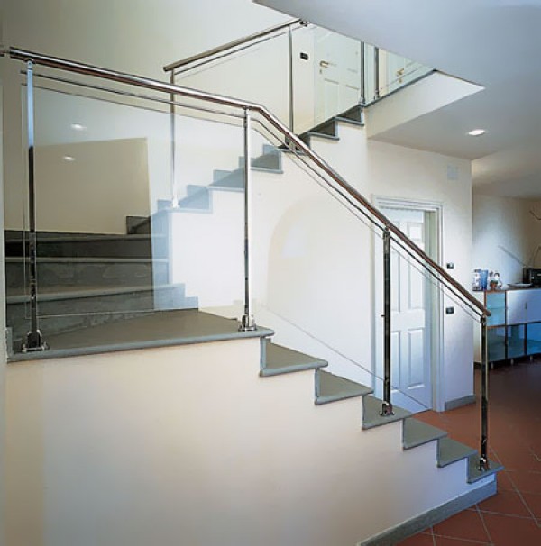 Скло сьогодні використовується як огородження для сходів – декоративні перила. У деяких випадках полотно, закріплене на сталевих стійках, саме по собі є поручнями, і поручень не встановлюється, при цьому краї скла відполіровані таким чином, що вони безпечні і про них не можна порізатися. Також роль поручня може виконувати сталева труба – це класична конструкція.